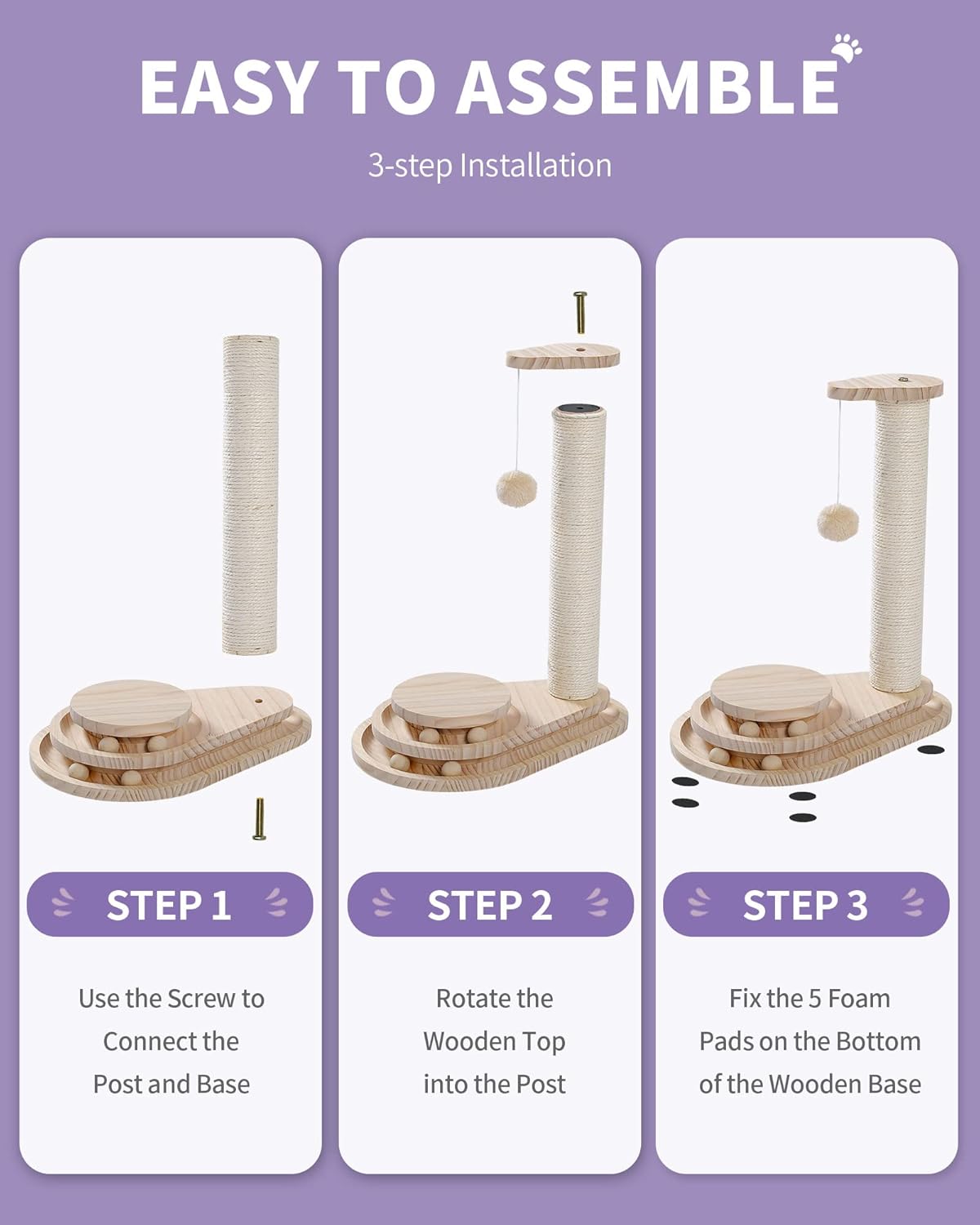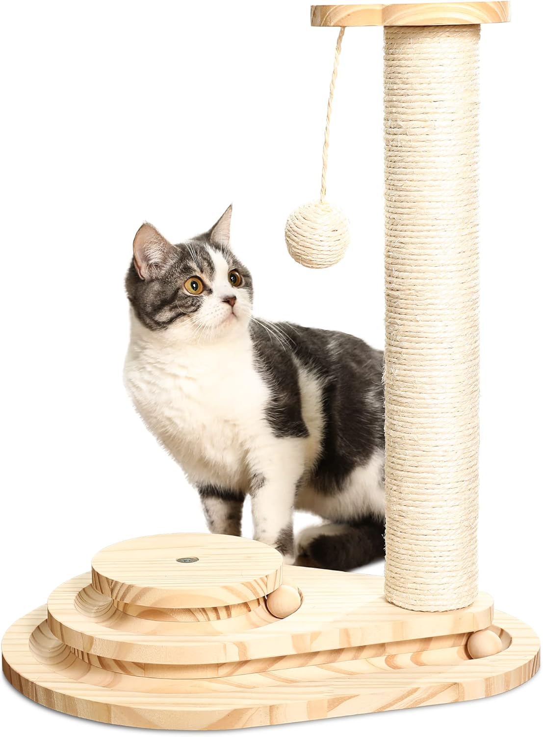 Play meets purpose. This modern 2-in-1 cat scratcher and toy tower offers both mental stimulation and physical activity in a compact, stylish design. Featuring a natural sisal-wrapped scratching post, a hanging plush ball, and a 3-tier wooden ball track, it encourages swatting, pouncing, clawing, and hours of engaged play.
